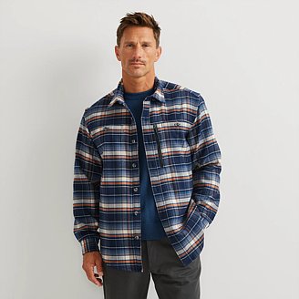 Our men's heavyweight flannel shirts are made from thick and warm flannel material. They are designed to provide warmth and comfort during colder months and are often worn as a casual or work shirt. The heavyweight nature of the flannel material makes it ideal for outdoor activities, such as camping or hiking, as it can withstand harsh weather conditions. Men's heavyweight flannel shirts come in various styles and colors and are often characterized by their softness, durability, and ability to keep the wearer warm and cozy. They are a popular choice for men who want a practical and stylish shirt that can be worn in a variety of settings. Explore our Men's Eddie's Favorite Faux Shearling-Lined Flannel Shirt Jacket for an all-in-one option. Built on rugged tradition and state-of-the-art innovation, this shirt definitely lives up to that legacy. It's a beefy, faux shearling lined flannel, designed with extra warmth, durability, in brushed cotton flannel for maximum comfort.
