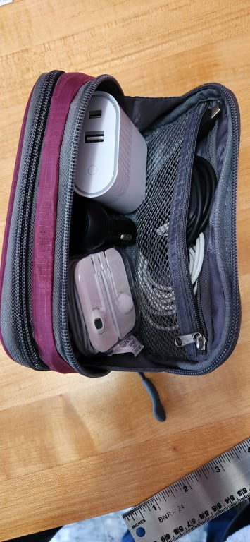 This is the organizational tool I needed for all those chargers and my air pods. I usually put them in a zippered pocket of my back pack so this was really a convenience purchase. I used it over the holidays and found it easy to have my chargers all in one place. It's not too big to put on the night stand in the hotel. I also could put some jewelry items in there if I wanted too. Wish they offered more colors, but the color isn't the important aspect of the product.